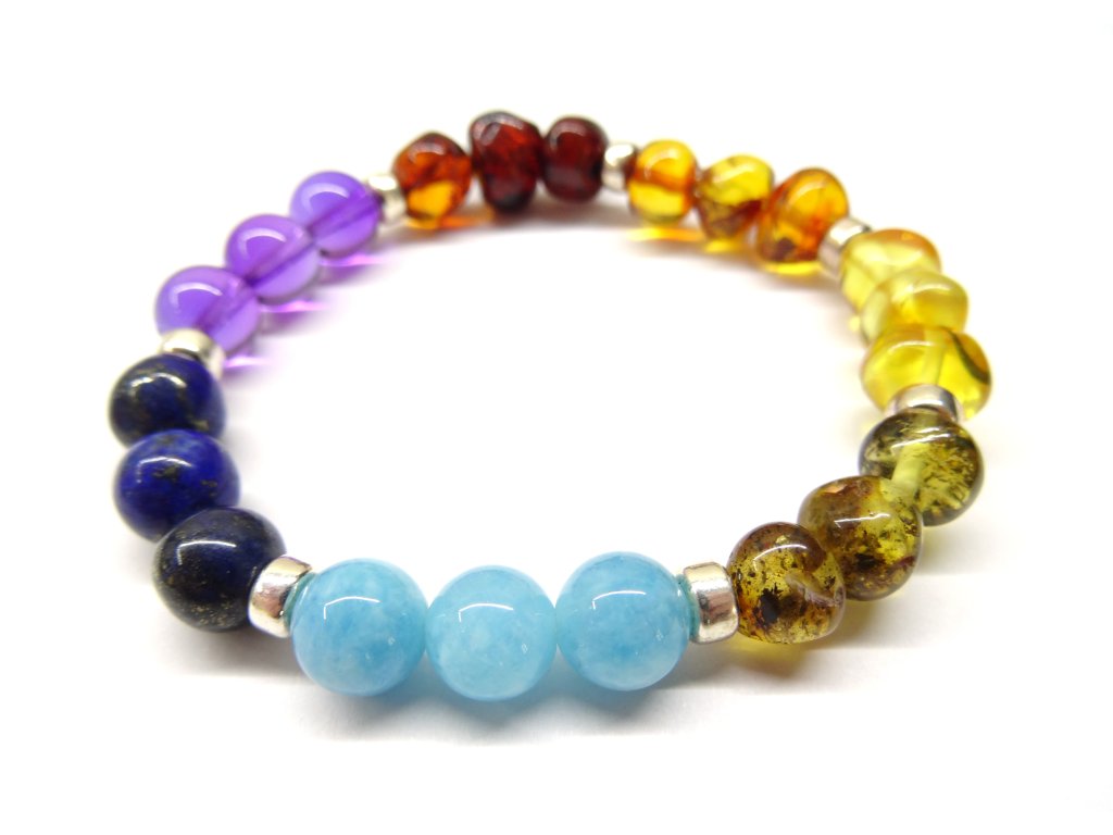 Mohutnejšie čakrový náramok kombinuje polodrahokamy, litovský jantár a striebro rýdzosti AG 925/1000. Navlečené na pružnej priehľadné gumičke. Priemer korálok je 0,8 cm. Dĺžka náramku cca 18 cm. Vyrobený ručne v Litve.